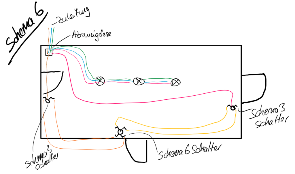 Die Schema 6 Schaltung kommt dann zur Anwendung, wenn ein Licht an mehr als zwei Stellen geschaltet werden soll. Dann wird zwischen die Schema 3-Schalter ein (oder mehrere) Schema-6-Schalter geschaltet.