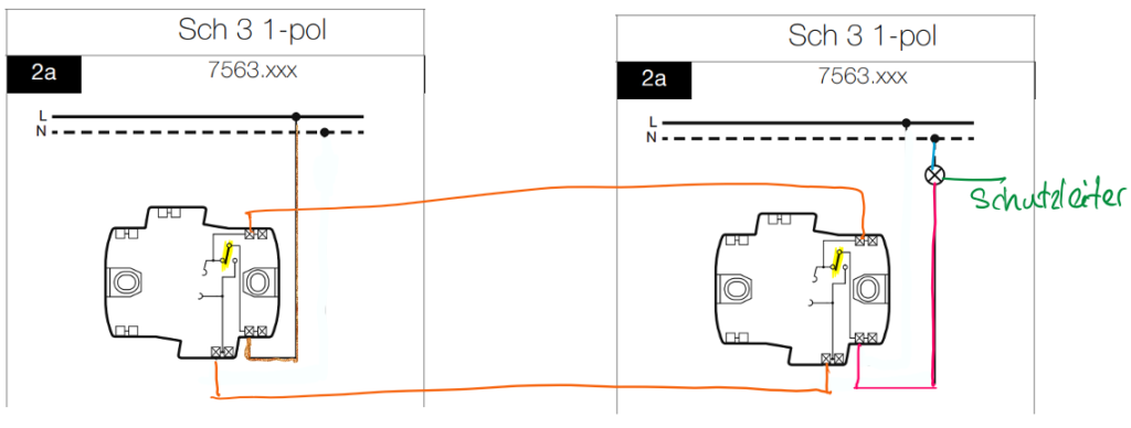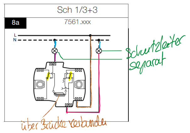 Die Schema 1 Schaltung wird in der Regel über einen doppelten Schema 3-Schalter umgesetzt. Dieser Schalter hat eine Brücke eingebaut, der die beiden Schalter verbindet (vgl. nächste Abbildung).