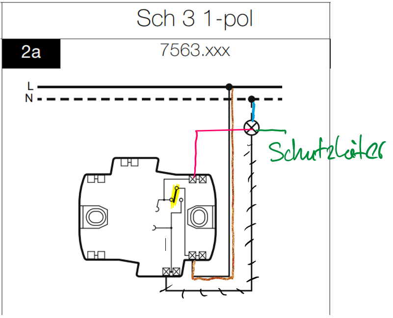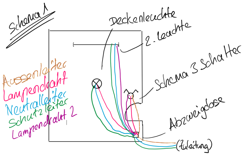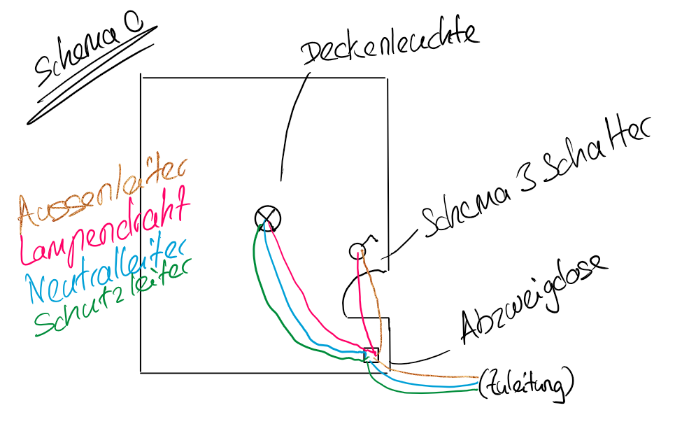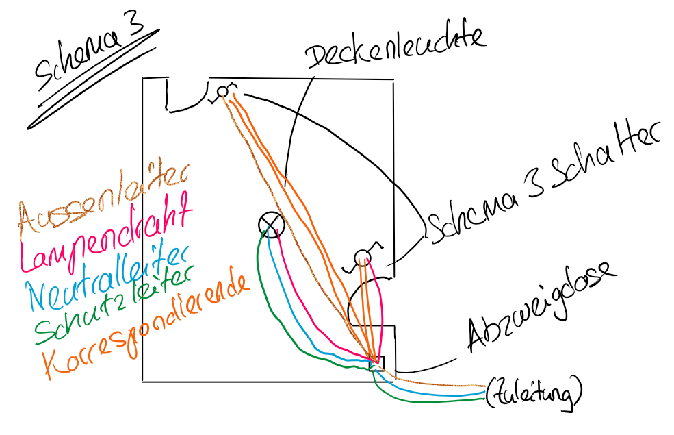 Es ist auch möglich, dass der Neutral- und Schutzleiter über den Schalter zur Lampe geführt wird. Dann geht der Lampendraht direkt vom Schalter zur Lampe und nicht über eine Abzweigdose.