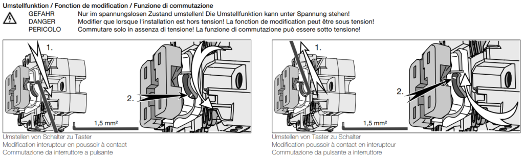 - Am besten nimmst du ein Stück Draht. Isoliere den Draht an der Spitze ab. Dann kannst du mit dem Draht dieses kleine Hebelchen (mit rotem Pfeil markiert) nach rechts schieben. So wird ein EDIZIOdue Schalter zu einem Taster.