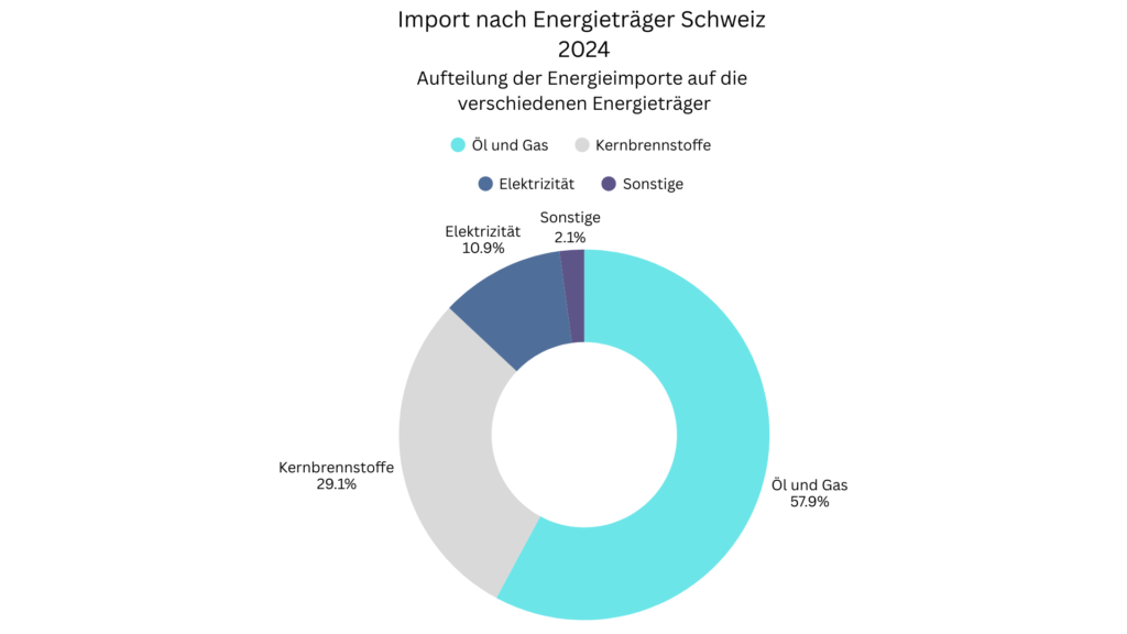 Bei mehr als der Hälfte dieser Energieimporte handelt es sich um Erdöl und Erdgas, bei einem Drittel um Kernbrennstoffe für AKWs. Nur gerade 10 % werden in Form von Strom importiert.