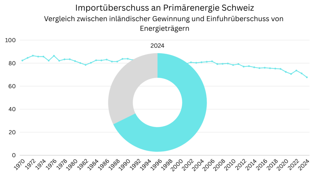 Nach wie vor wird ein grosser Teil der in der Schweiz verbrauchten Energie aus dem Ausland importiert. 2024 waren es 67.7 %.